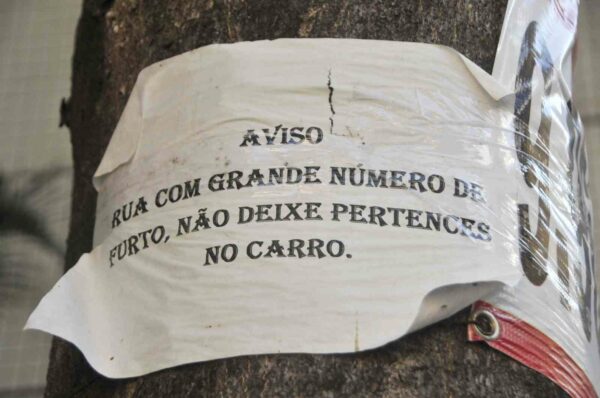 Aterrorizados pela onda de furtos e arrombamentos de veículos, especialmente na Rua Martinho Campos, moradores estão deixando recados, afixados no tronco, com a frase: "Rua com grande número de furtos. Não deixe pertences no carro".