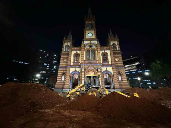 A fachada da Igreja São José, no Centro de Belo Horizonte, está temporariamente modificada por causa de uma obra emergencial, devido ao entupimento da rede de esgoto do santuário. Bem no pátio do local, maquinários, como uma retroescavadeira, e um buraco de mais de 1,7 metro de profundidade fizeram parte de um dos cartões postais da capital.