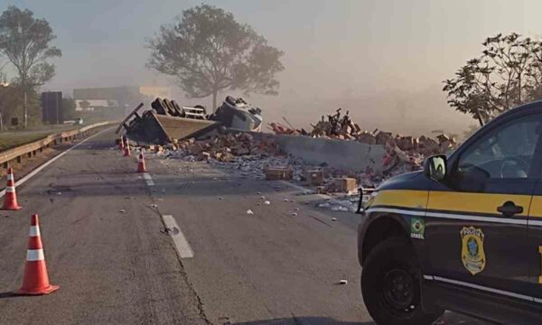 Segundo a Polícia Rodoviária Federal (PRF), o motorista, de 29 anos, perdeu o controle da carreta em uma curva e o veículo tombou. Parte da carga se espalhou pela pista, fazendo com que o trânsito no local fosse impedido.