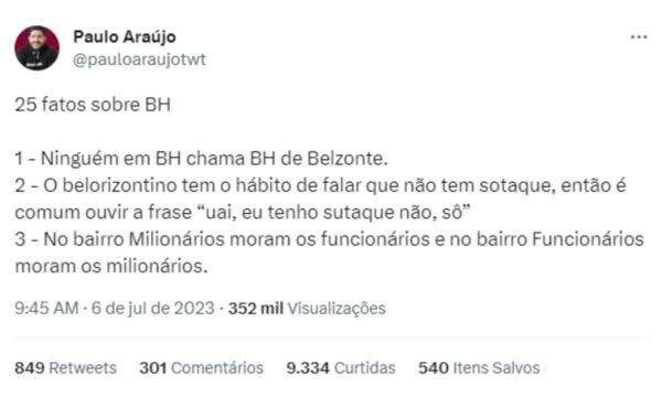 O comediante, que sempre menciona tais diferenças de forma bem humorada, listou 25 fatos sobre a cidade de Belo Horizonte em seu perfil no Twitter nesta quinta-feira (6/7) e ganhou grande repercussão. A thread, que já alcançou 352 mil visualizações na manhã desta sexta-feira (7/7), divertiu internautas, belo-horizontinos ou não.