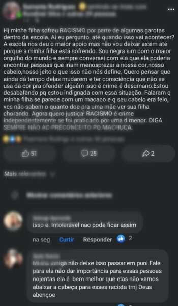 Compartilhe no WhatsApp Compartilhe no Telegram De acordo com o Boletim de Ocorrência (BO), a garota teria sido chamada de "macaca" por três alunas, pois o "cabelo dela seria ruim e pelo modo com que ela divide o mesmo". Ainda conforme o registro, os pais das estudantes e o Conselho Tutelar foram chamados à unidade escolar. O g1 entrou em contato com a Secretaria de Estado de Educação (SEE) para saber quais medidas foram tomadas e aguarda retorno. A reportagem também procurou a Polícia Civil para saber se o caso será apurado, mas ainda não obteve resposta até a última atualização desta matéria. Além da ocorrência, a mãe da adolescente expôs a situação nas redes sociais e "afirmou que recebeu apoio da escola". Mãe denuncia injúria racial sofrida por filha em escola em Juiz de Fora g1 O g1 optou por não citar o nome da mãe e da escola para preservar a adolescente. LEIA TAMBÉM: VAI BRASIL: Publicitária de Juiz de Fora concorre a prêmio em Cannes por peça sobre a equidade de gênero na gastronomia POLICIAL: Esquema de pirâmide financeira que deu prejuízo de mais de R$ 15 milhões em MG, RJ e BA é desmontado em operação VÍDEO: Chef Fogaça é mordido por quati e vai parar em hospital: 'Na próxima vez dou a banana no garfo' 📲 Confira as últimas notícias do g1 Zona da Mata 📲 Acompanhe o g1 no Facebook e Instagram 📲 Receba notícias do g1 no WhatsApp e no Telegram VÍDEOS: veja tudo sobre a Zona da Mata e Campos das VertentesFONTE: G1 Globo