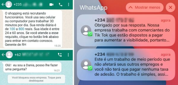 Usuários relatam que desconhecidos oferecem supostas vagas de emprego e chegam fazer ligações para chamar atenção. Números estrangeiros desconhecidos têm entrado em contato com usuários de WhatsApp